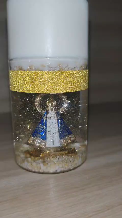 Dentro de um frasco de vidro cristalino, repousa a imagem de Nossa Senhora Aparecida, com manto azul e coroa dourada, decorados com pedrarias reluzentes e delicados detalhes em branco e dourado.
